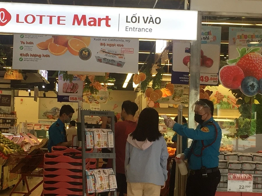 Tại các siêu thị như Lotte Mart Tân Bình, Co.opmart SCA Âu Cơ Tân Phú, Aeon Celadon Tân Phú đều yêu cầu khách đeo khẩu trang, đo thân nhiệt, bố trí nước sát khuẩn cho khách trước khi vào siêu thị…