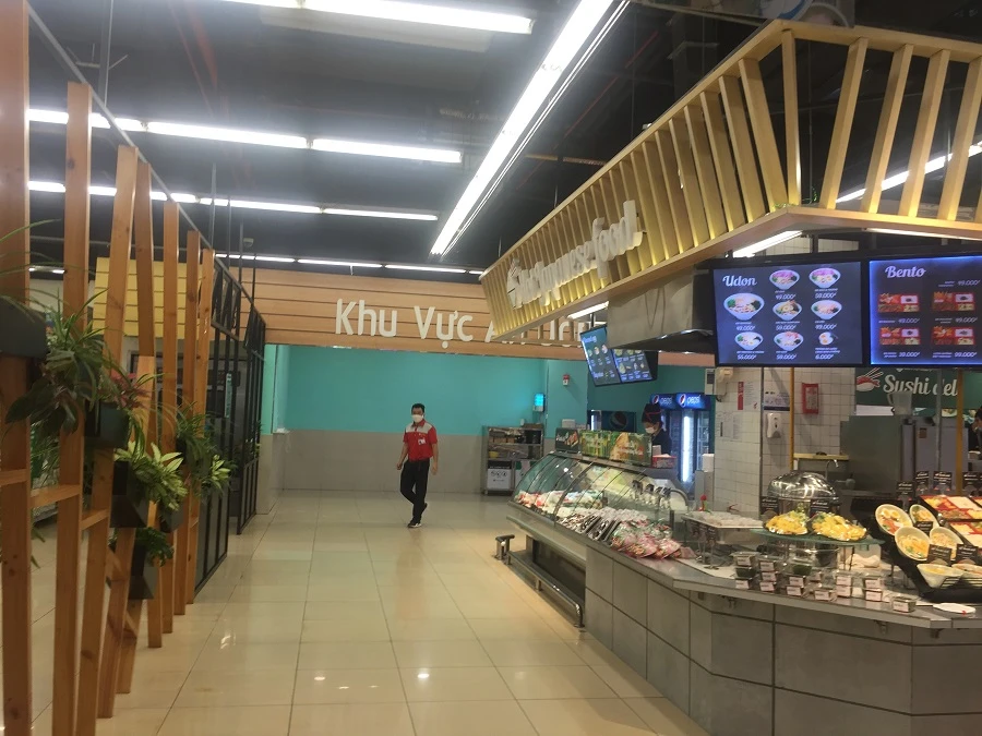 Khu vực ăn uống tại Lotte Mart Tân Bình nay cũng tạm dừng phục vụ khách tại chỗ.