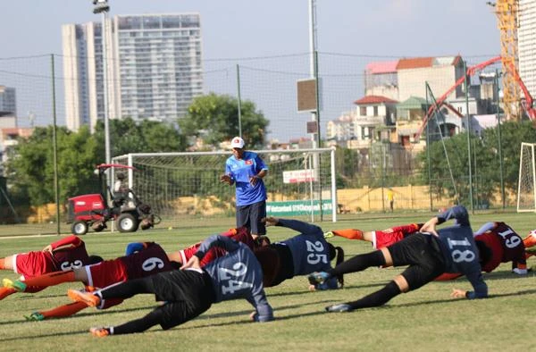 Thầy trò Mai Đức Chung tập luyện dưới thời tiết nắng nóng gay gắt nhưng ai cũng rất nỗ lực. Ảnh: AN