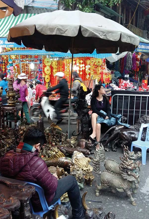 Phố cổ Hà Nội lúc nào cũng chật chội nhưng lại “rộng rãi” cảnh tượng đặc sắc. Ra Hà Nội đúng ngày đưa ông Công-ông Táo, có thể bạn sẽ ngỡ ngàng trông thấy trên vỉa hè những mâm vàng mã nhiều màu sắc xếp cùng những chiếc thau đựng cá chép còn tung tăng trong nước. Các bà cụ phố cổ vẫn tiễn thần linh lên trời bằng một nghi thức trang trọng và huyền bí. Và rồi, mặc dù cả khu 36 phố phường đã là một ngôi chợ Tết khổng lồ nhưng vẫn có riêng một ô phố nhỏ cho hai phiên chợ vừa quen vừa lạ, nằm liền bên nhau. Đó là chợ hoa Hàng Lược và chợ đồ cổ ngã năm, mỗi năm chỉ họp một lần từ 20 đến 30 Tết.
