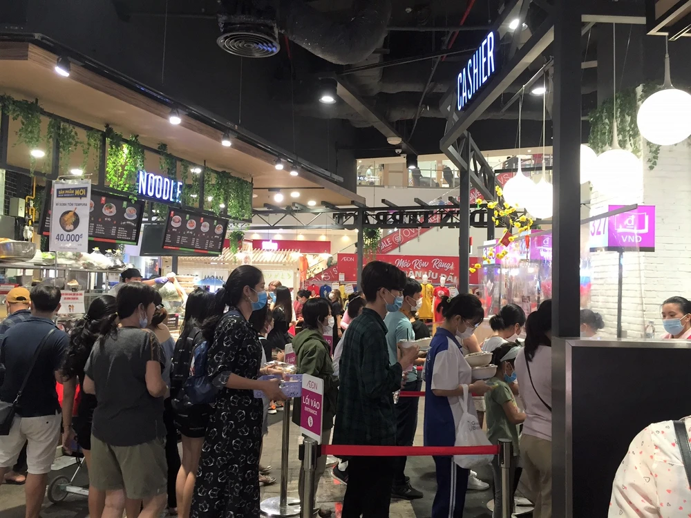 Khách hàng xếp hàng chờ tính tiền khu vực ẩm thực tự chọn. Ảnh: TÚ UYÊN