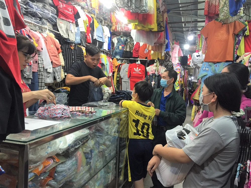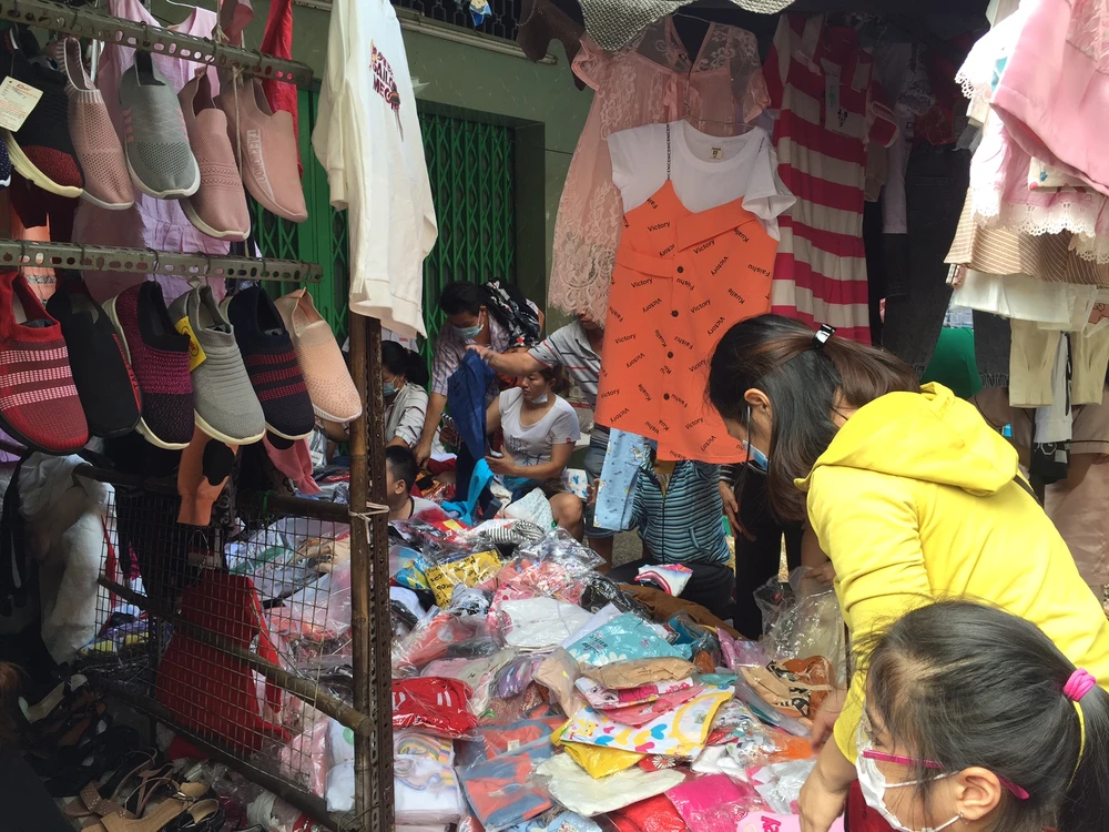 Các sạp quần áo, giày dép tương đối đông khách hơn so với các ngành hàng khác. Ảnh: TÚ UYÊN
