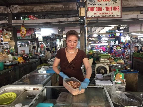 Sức mua các mặt hàng thịt cua, thịt ghẹ làm sẵn dịp tết tây giảm hơn 50% so với năm ngoái. Ảnh: TÚ UYÊN