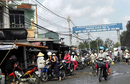 Chợ tự phát ngay trên đường trước chợ khiến người buôn bán đúng quy định gặp nhiều khó khăn. Ảnh: THÁI HIẾU