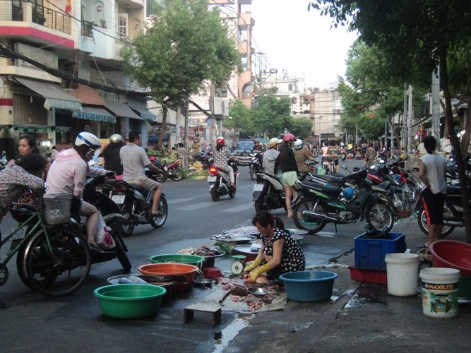 Quầy bán hải sản, nước lan ra đường lênh láng