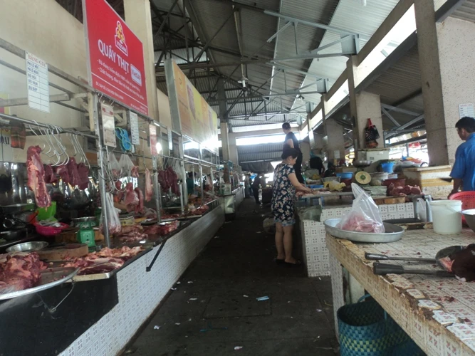 Quầy thịt sống phía trong chợ Hiệp Bình Chánh không có mấy khách mua hàng