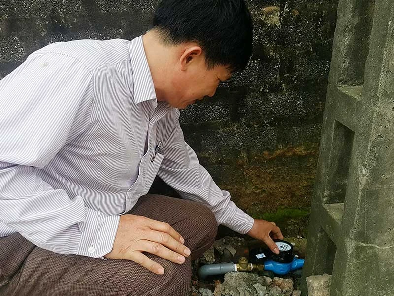 Sau sáu năm bán nước máy cho các hộ dân, ông Trần Văn Hồng mới đi kiểm tra đồng hồ đo nước và truy thu tiền trung bình mỗi hộ hàng chục triệu đồng. Ảnh: Đ.LAM