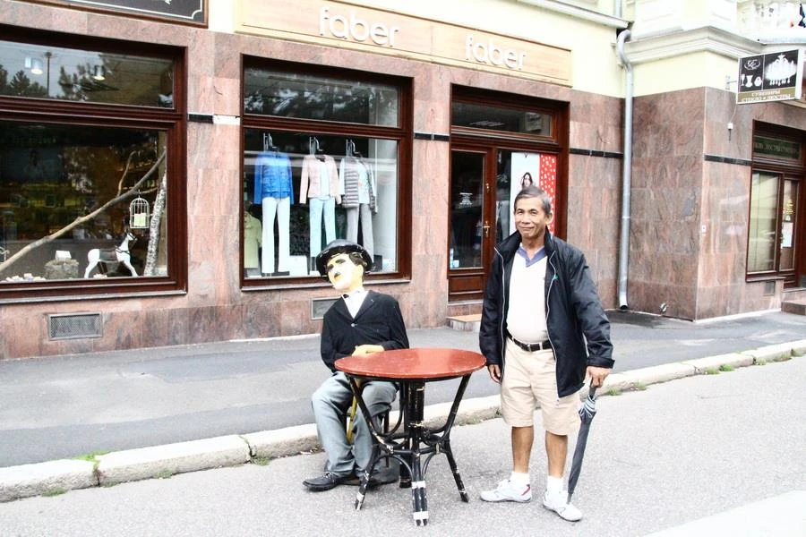 Du khách chụp ảnh lưu niệm bên hình mẫu danh hài Charlot.