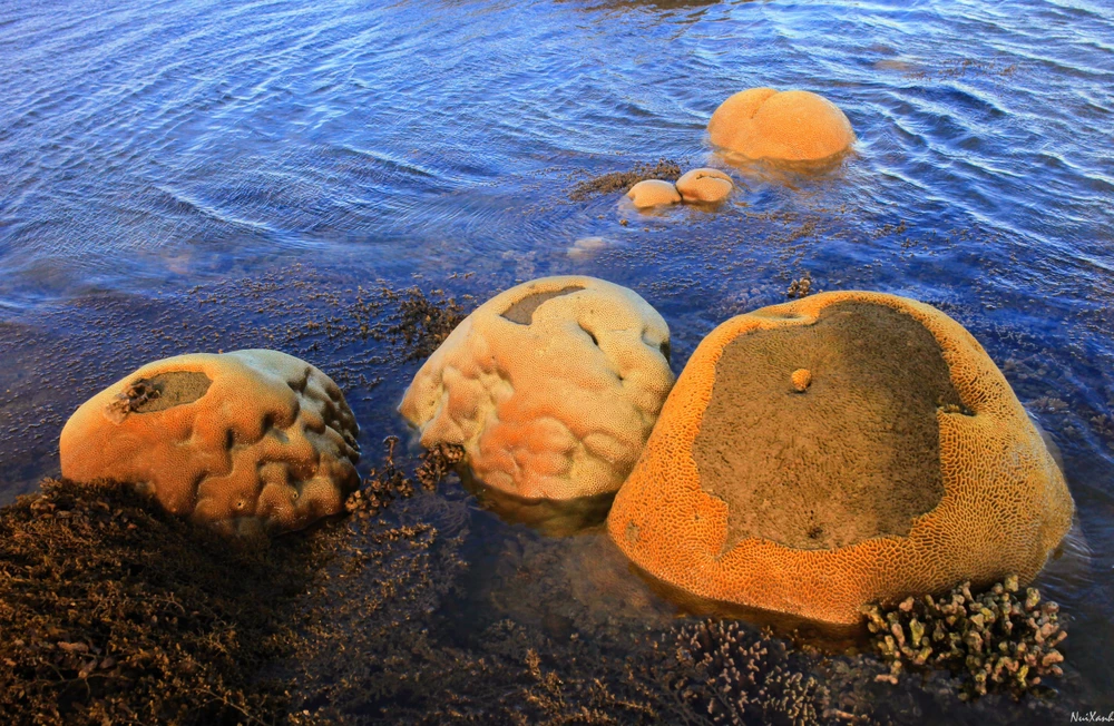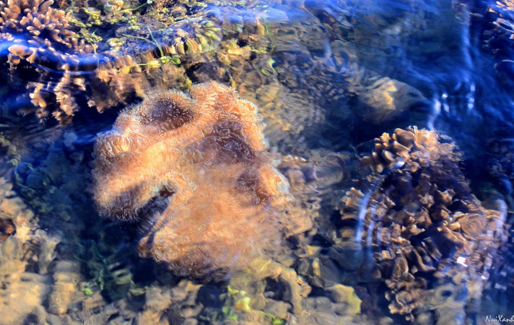 Có những cụm san hô màu xanh, màu tím như những cánh hoa đong đưa dưới mặt nước. Có cụm to như cái trống trường, nhìn như mặt một con vật trong truyện cổ tích thật ngộ nghĩnh. Ven những cụm san hô chết là chi chít những cây rong nho non, phía dưới là những hang hốc nơi trú ngụ của bầy ghẹ, tôm con...