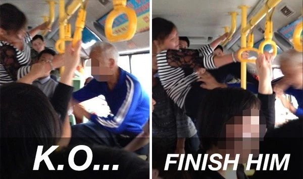 Khi được các hành khách trên xe buýt yêu cầu nhường chỗ cho cụ ông vì thấy cụ đã tuổi già sức yếu, cô gái trẻ không ngần ngại chửi rủa rồi "tung chưởng" đu mình trên tay vịn của xe buýt và đá thẳng vào mặt cụ. Hành động của cô gái khiến những người đi trên tuyến xe buýt này đều vô cùng choáng váng.