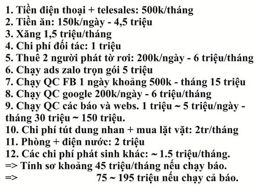 Số tiền chi tiêu cá nhân và tìm kiếm khách hàng lên đến gần 200 triệu được một môi giới tung lên mạng trở thành đề tài nóng thu hút sự quan tâm của cộng đồng. Theo thống kê này thì nếu không chạy quảng cáo trên báo, chi phí đã là 45 triệu/tháng.