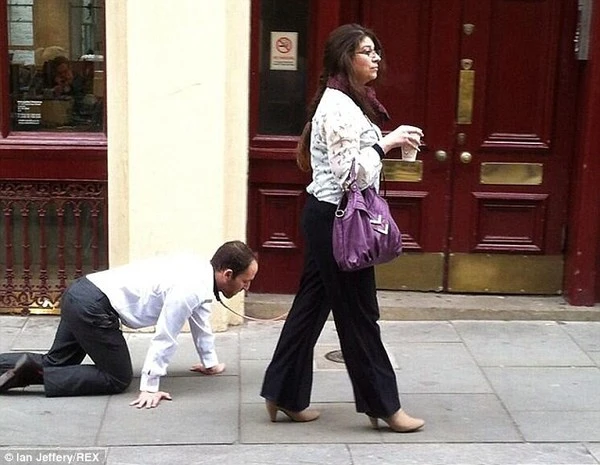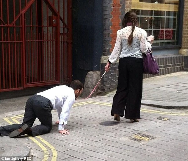 Với 1 chiếc dây được quấn quanh cổ áo quanh cổ, người đàn ông trong bộ quần áo chỉn chu rất ngoan ngoãn bò theo sau 1 người phụ nữ băng qua các tuyến phố ở Farringdon.