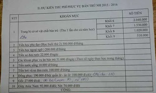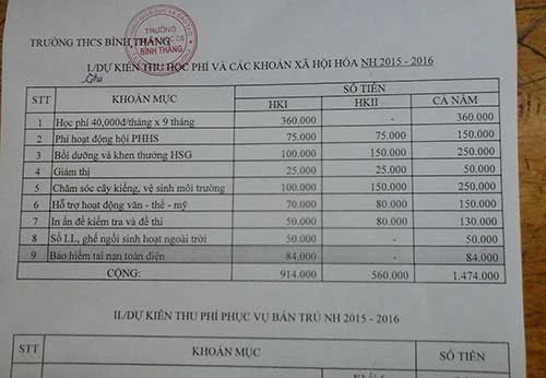 Không ít phụ huynh đọc xong thông báo đã bày tỏ lo lắng vì họ biết xoay đâu ra một lúc số tiền lớn như thế. Theo đó, phần một của thông báo liệt kê chín khoản thu với tổng số tiền phụ huynh phải đóng là 1.747.000 đồng. Đáng nói trong đó có nhiều khoản thu “lạ” cũng được “XHH” chia đều và yêu cầu cho mỗi phụ huynh đóng: Phí giám thị: 50.000 đồng/năm; chăm sóc cây cảnh và vệ sinh môi trường: 250.000 đồng/năm; hỗ trợ hoạt động văn - thể - mỹ: 150.000 đồng/năm; sổ liên lạc và ghế ngồi sinh hoạt ngoài trời: 50.000 đồng/năm... Phần 2 của thông báo liệt kê 10 khoản, trong đó khoản trang bị CSVC bán trú thu một lần 2.040.000 đồng với HS lớp 6, 1.530.000 đồng với HS lớp 7, 1.020.000 đồng với HS lớp 8… Ngoài ra, HS phải đóng tiền học phụ đạo 300.000 đồng/tháng, tiền học ngoại ngữ 200.000 đồng/tháng…