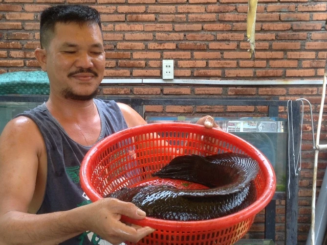 Theo ông Mộng, cách đây một năm ông mua con cá lóc nặng 0,8 kg ở chợ rồi mang về nuôi trong hồ kiếng. “Tôi chỉ định nuôi để hai đứa con ngắm chơi, đến ngày nào đó làm thịt. Nhưng không ngờ cá lớn quá nhanh nên tôi quyết định nuôi luôn. Lúc mới nuôi tôi cho ăn cá con, từ từ tôi cho mỗi ngày ăn một con cá kèo nhỏ. Hiện giờ mỗi ngày ăn bốn con cá kèo lớn” – ông Mộng nói.