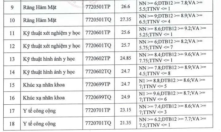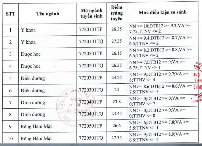 Trong đó, ngành Y khoa vẫn là ngành có điểm chuẩn cao nhất vào trường với 26,9 điểm. Kế đến là Răng hàm kặt với 26,7 điểm. Khoa Y học dự phòng có điểm chuẩn thấp nhất với 22,35 điểm.