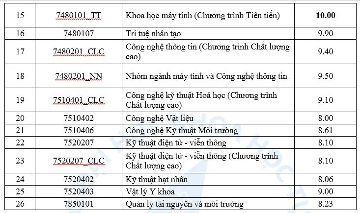 Cùng với đó, ở phương thức ưu tiên xét tuyển thẳng và ưu tiên xét tuyển theo quy định của ĐH Quốc gia TP.HCM, các ngành đều có mức điểm rất cao khi đòi hỏi thí sinh phải đạt từ 8.0 trở lên mới có thể trúng tuyển, thậm chí có ngành là Khoa học máy tính (chương trình tiên tiến) đạt 10 điểm và Trí tuệ nhân tạo là 9.9.