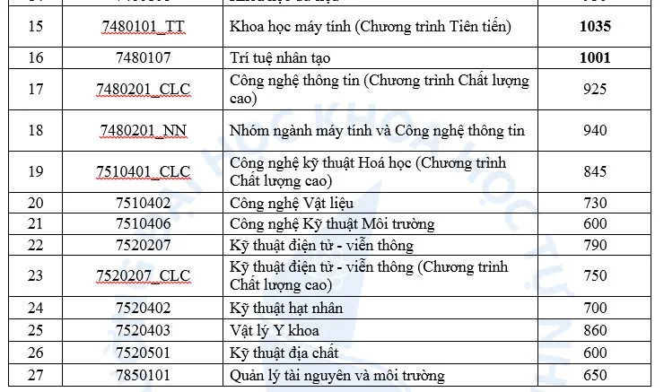 Đáng chú ý, ở phương thức xét điểm thi đánh giá năng lực do ĐH Quốc gia TP.HCM tổ chức năm 2023, điểm chuẩn dao động từ 600 điểm trở lên. Đặc biệt, có đến hai ngành có mức điểm chuẩn cao kỷ lục là ngành Khoa học máy tính (chương trình tiên tiến) có mức điểm 1.035, thang điểm 1.200 và ngành Trí tuệ nhân tạo với mức điểm 1.001.