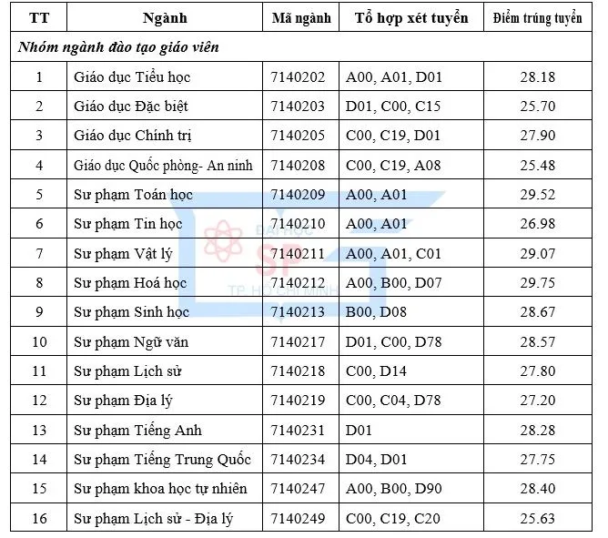 Điểm chuẩn dao động từ 24 đến 29,75 điểm. Trong đó, cao nhất là sư phạm Hóa học với 29,75 điểm, kế đến là Sư phạm Toán học với 29,52 điểm. Một số ngành trên 28 điểm như sư phạm Vật lý, sư phạm tiếng Anh, giáo dục Tiểu học…