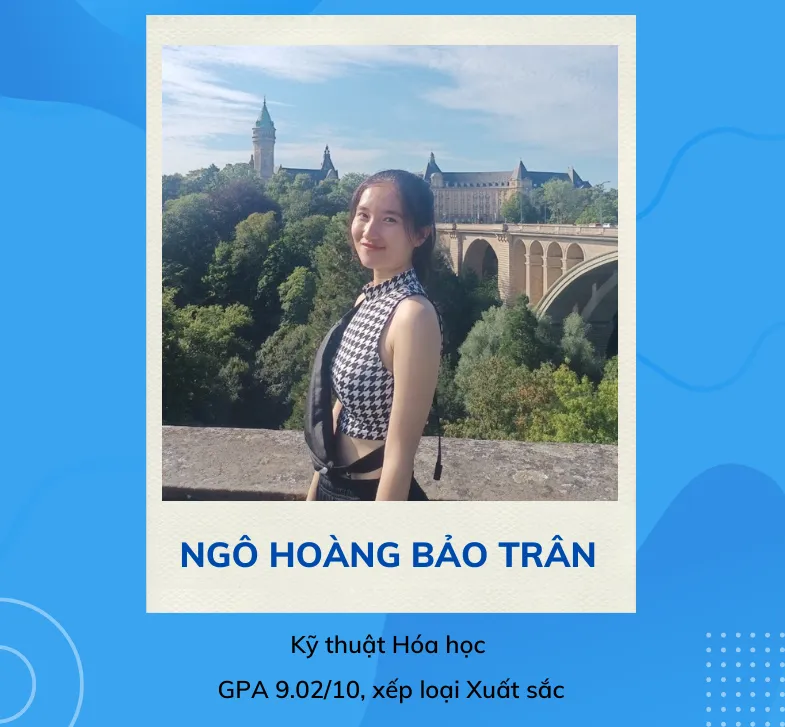 Thứ nhất, em Ngô Hoàng Bảo Trân (khoa kỹ thuật hóa học). Em là sinh viên duy nhất của trường đoạt Giải thưởng Nữ sinh Khoa học Công nghệ Việt Nam năm 2022 ở lĩnh vực Công nghệ Kỹ thuật Hóa học.