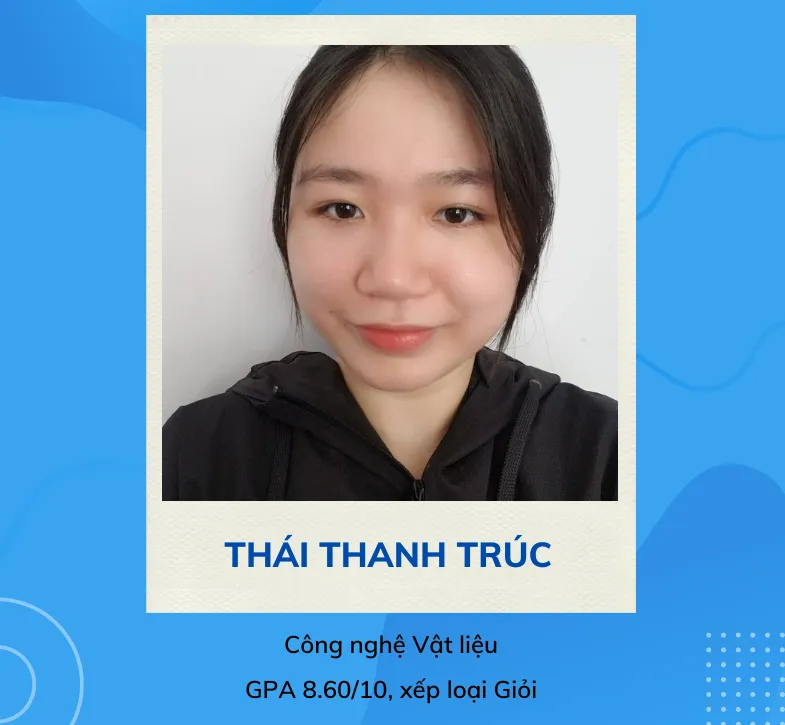 Thứ tư là em Thái Thanh Trúc (khoa công nghệ vật liệu), tốt nghiệp với điểm GPA 8,6/10, đạt loại giỏi.
