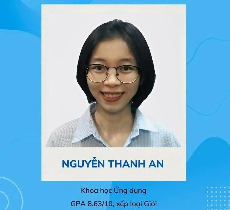 Thứ sáu là Nguyễn Thanh An (khoa khoa học ứng dụng), đạt điểm GPA 8,63/10, xếp loại giỏi. Trong học tập, cô nàng đã từng đạt học bổng khuyến khích ba năm 2019, 2020, 2021 (5 kỳ liên tiếp).