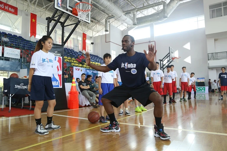 HLV trưởng Jr. NBA Chris Sumner dạy kỹ thuật chơi bóng rổ cho các vận động viên.
