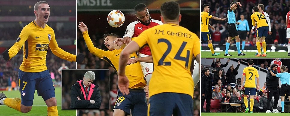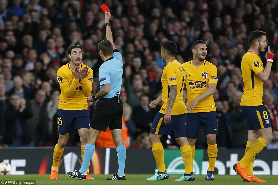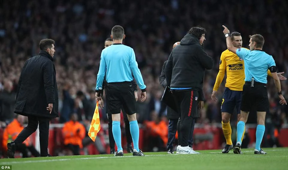 Chính vì thế, khi trận đấu mới trôi qua 10 phút, Vrsaljko phải nhận hai thẻ phạt liên tiếp từ trọng tài Clement Turpin từ hai tình huống đạp vào chân Wilshere và Lacazette. Bên ngoài sân, HLV Diego Simeone không ngừng gào thét phản đối trọng tài và chính ông cũng bị đuổi lên khán đài vì lỗi phản ứng thái quá.
