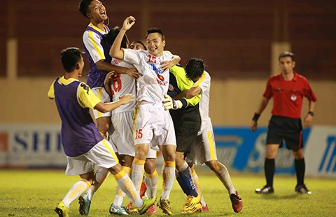 Niềm vui vào chung kết và đòi được món nợ trước PVF của các cầu thủ U-19 Hà Nội T&T. Ảnh: XUÂN HUY