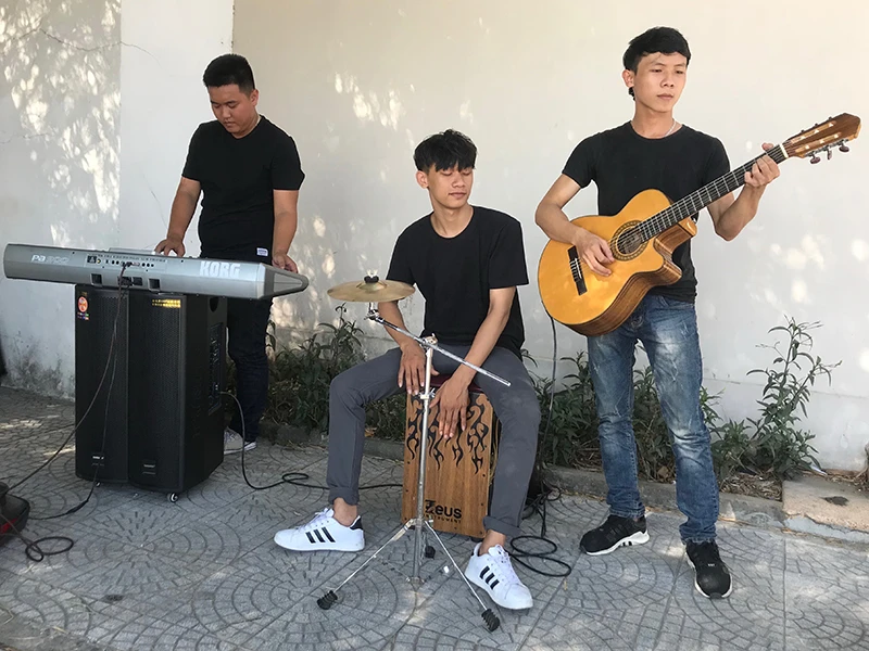 Nhóm sinh viên đang biểu diễn trên một vỉa hè ở Đà Nẵng. Ảnh: HẢI HIẾU