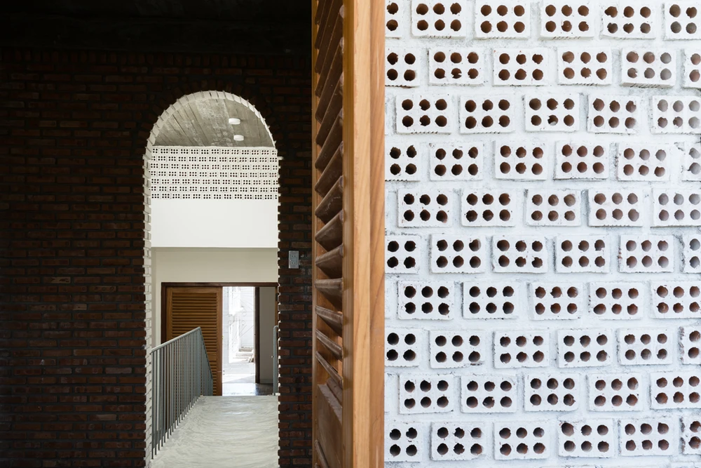 Mái vòm trong nhà thiết kế theo truyền thống Bắc Trung Bộ và gạch sử dụng gạch i nguyên không tô trát.
