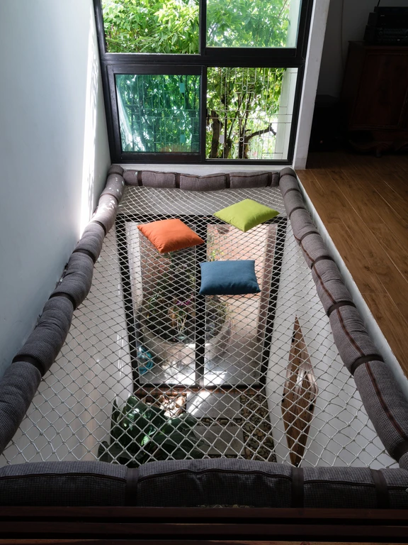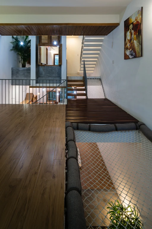 Ngôi nhà còn có khoảng thông tầng có trồng dàn cây leo trĩu xuống dưới.