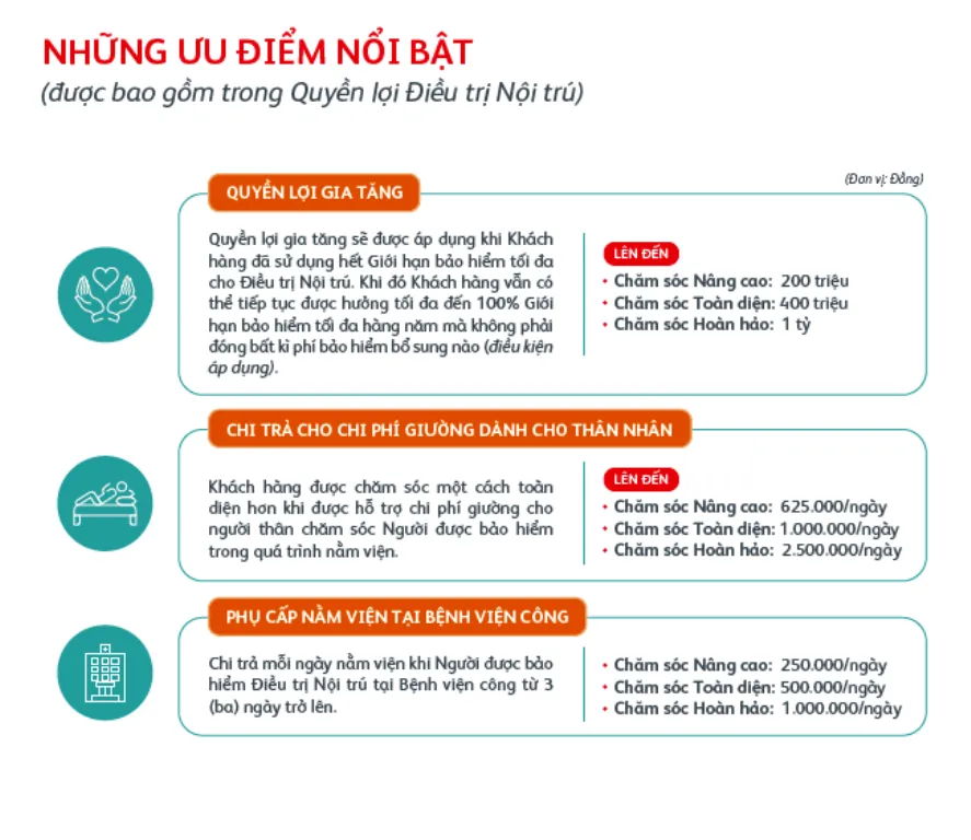 Khách hàng có thể lựa chọn một trong ba chương trình chăm sóc sức khỏe khác nhau: nâng cao, toàn diện và hoàn hảo với Giới hạn bảo hiểm tối đa hằng năm từ 200 triệu đồng đến 1 tỉ đồng, đáp ứng nhu cầu các nhóm khách hàng trong từng giai đoạn cuộc sống