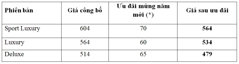(*) Gói ưu đãi bao gồm ưu đãi giá bán (30-40 triệu), tặng bộ phụ kiện (10 triệu) và tặng gói bảo dưỡng ba năm miễn phí (20 triệu).