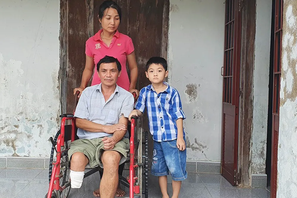 Gần hai năm nay, anh Thìn phải ngồi xe lăn, chỉ quanh quẩn trong nhà do chân phải đã bị cắt bỏ.