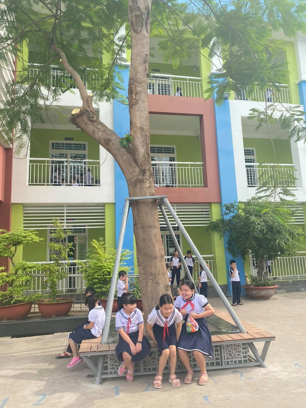 Thay vì chặt hạ cây xanh, không ít trường đã có sáng kiến bảo vệ cây bằng giải pháp dùng khung sắt để chống đỡ.