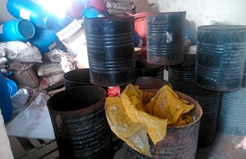 Các thùng phuy chứa chất vàng ô vừa được Thanh tra Bộ NN&PTNT phát hiện tại Công ty Việt Nhật (Hưng Yên) ngày 16-11. Ảnh: CTV