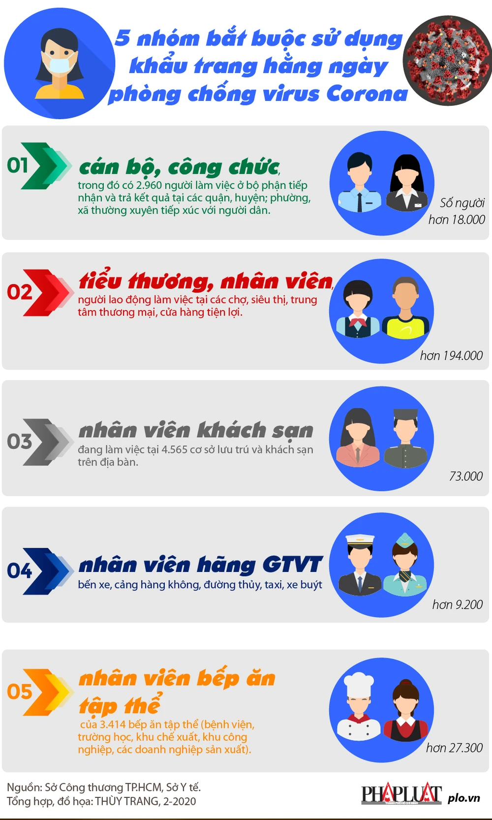 (PLO)- Đến 11 giờ trưa 6-2, toàn cầu đã có gần 1.200 người khỏi bệnh. Sở Công Thương TP.HCM vừa phối hợp với Sở Y tế xác định năm nhóm bắt buộc sử dụng khẩu trang hằng ngày. Với nhu cầu sử dụng bình quân ba cái khẩu trang y tế/ngày/người thì các đối tượng ưu tiên cần hơn 966.000 cái mỗi ngày.