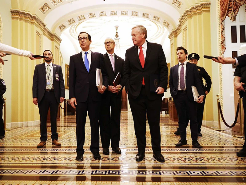 Từ trái qua: Bộ trưởng Tài chính Steven Mnuchin, Giám đốc về các vấn đề lập pháp Nhà Trắng Eric Ueland và Chánh Văn phòng Nhà Trắng Mark Meadows có mặt tại trụ sở Quốc hội Mỹ để thảo luận lần cuối gói cứu trợ 2.000 tỉ USD ngày 24-3. Ảnh: CNBC