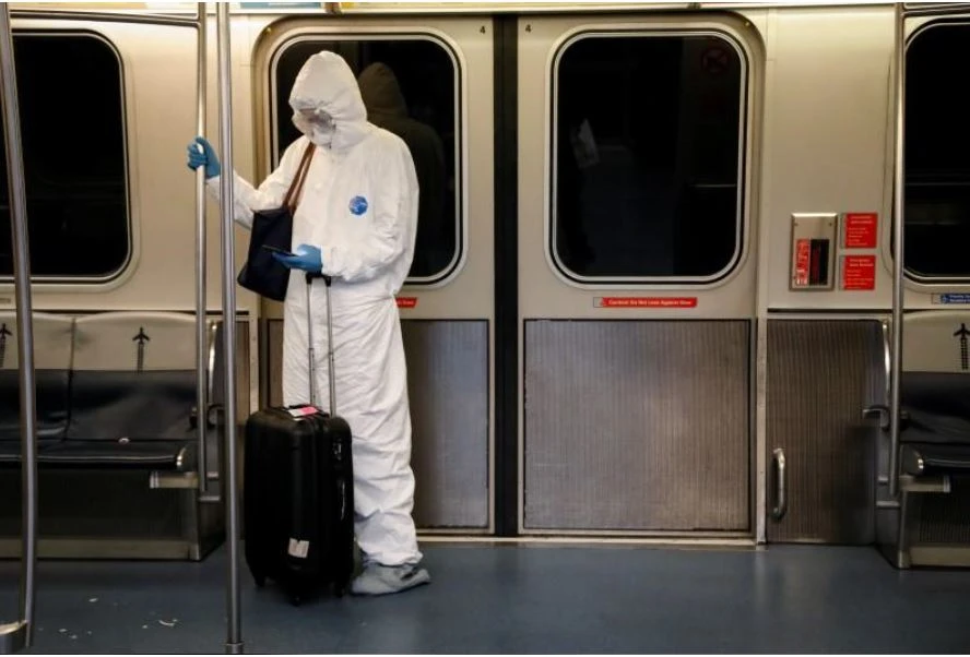 Hành khách mặc nguyên bộ đồ bảo hộ trên xe buýt ra máy bay tại sân bay quốc tế John F. Kennedy ở TP New York, bang New York (Mỹ) ngày 20-3. Ảnh: REUTERS