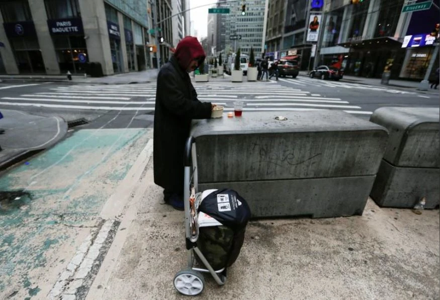 Người vô gia cư dùng bữa giữa đường phố New York, bang New York (Mỹ) ngày 20-3. Ảnh: REUTERS
