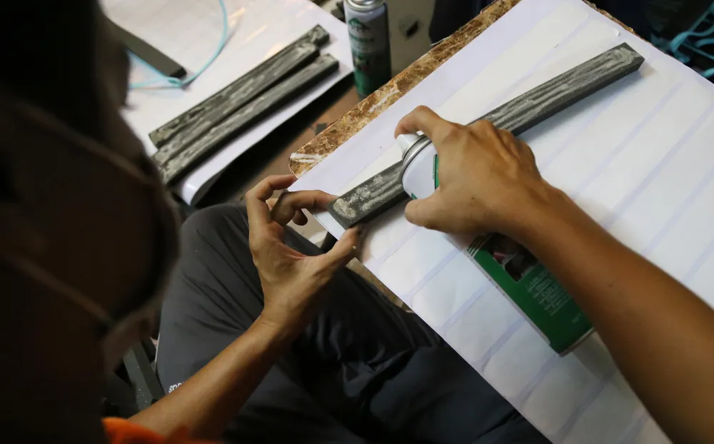 Một thành viên trong nhóm xịt keo dán vào mút xốp để dán lên mặt nạ.