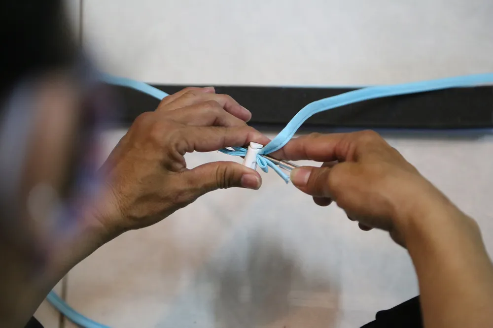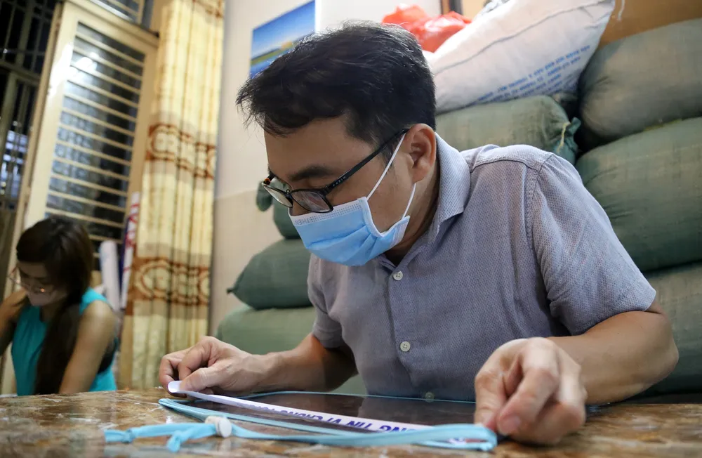 Trong căn phòng diện tích chừng 20 m2 chất đầy nguyên vật liệu để làm mặt nạ, 5 người chia nhau 5 công đoạn từ dán thông điệp, gắn dây rút, miếng đệm… để tạo ra một sản phẩm hoàn hảo.