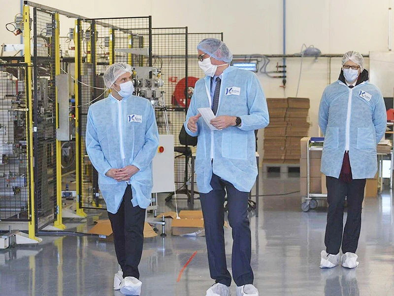 Tổng thống Pháp Emmanuel Macron (trái) đến thăm nhà máy sản xuất khẩu trang tại Kolmi-Hopen ở Saint-Barthelemy-d’njou (phía Tây nước Pháp) hôm 31-3. Ảnh: AP
