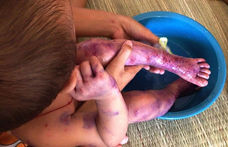 Một trẻ bị bệnh tay-chân-miệng ở Đồng Tháp chuyển lên BV Nhi đồng 1 điều trị. (Ảnh chụp ngày 22-5) Ảnh: TÙNG SƠN