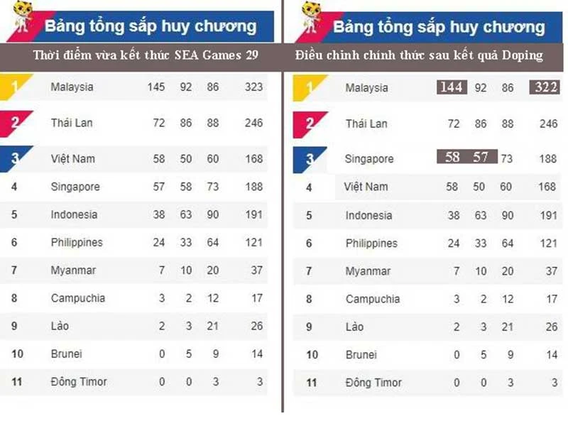 Nguyên nhân của việc đoàn thể thao Singapore thế chỗ thứ ba của thể thao Việt Nam xuất phát từ kết quả chống doping của Hội đồng SEA Games. Theo đó trong bốn VĐV tham dự SEA Games 29 có kết quả dương tính ở cả hai mẫu thử doping, có VĐV nhảy cầu của chủ nhà Malaysia Wendy Yan Yee. Đây cũng là VĐV đoạt HCV môn nhảy cầu của chủ nhà nên tất nhiên Hội đồng SEA Games phải tước thành tích của VĐV này. Vì thế mà VĐV Singapore Fong Kai Yian từ HCB ở nội dung trên được đôn lên nhận HCV. Với kết quả có sự điều chỉnh từ Hội đồng SEA Games 29, đoàn Singapore với tổng số 57 HCV sẽ được cộng thêm 1 HCV của Fong Kai Yian nâng tổng số HCV chính thức lên 58 chiếc.