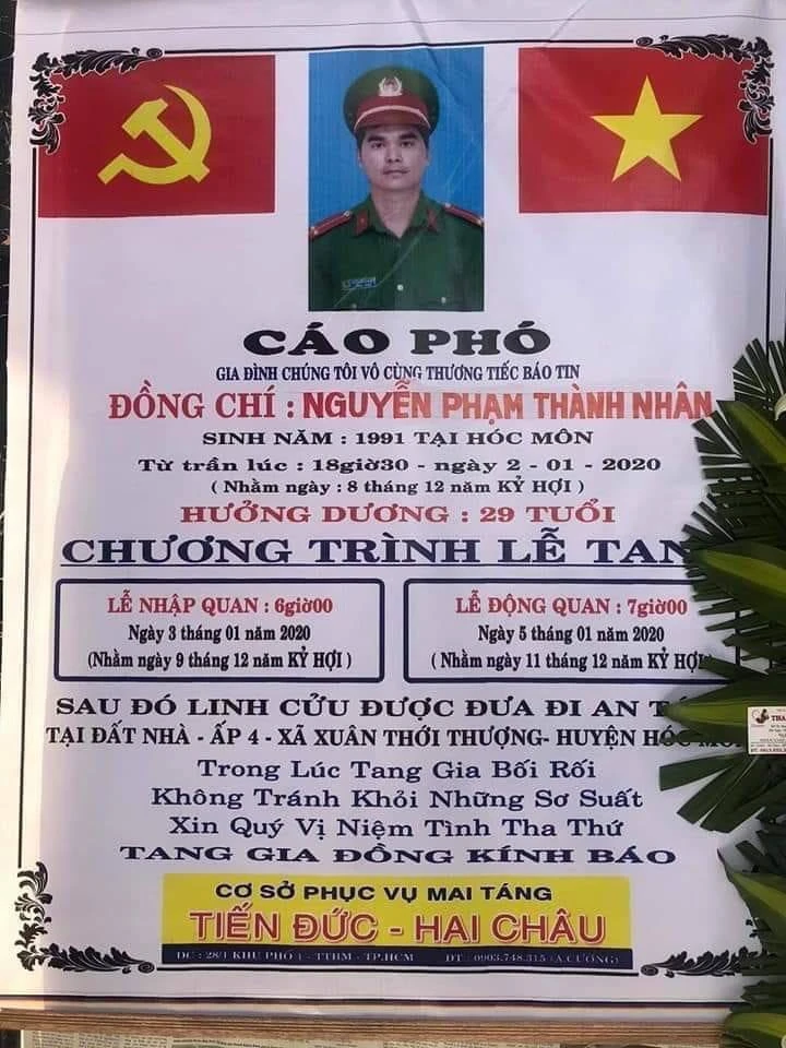 Công an TP.HCM vừa cho biết Trung úy Nguyễn Phạm Thành Nhân (thuộc Đội Cảnh sát giao thông - Trật tự Công an huyện Hóc Môn) đã trút hơi thở cuối cùng tại BV 115 TP.HCM.