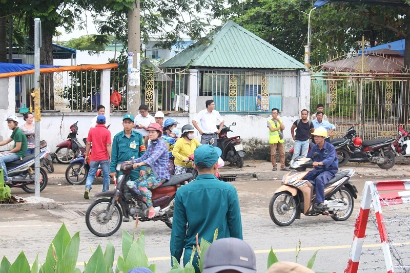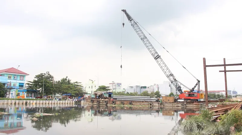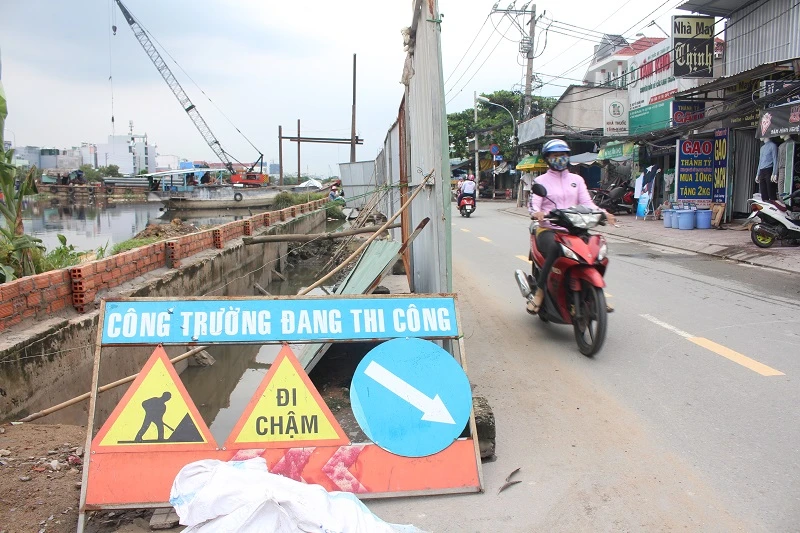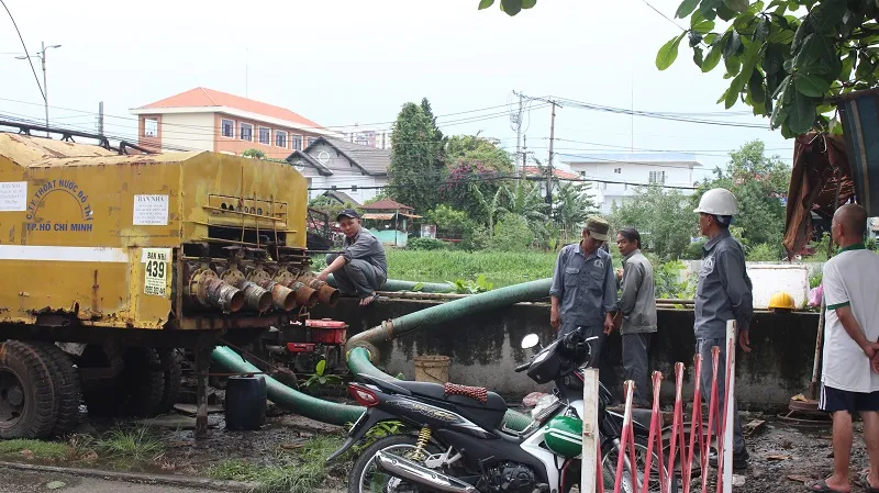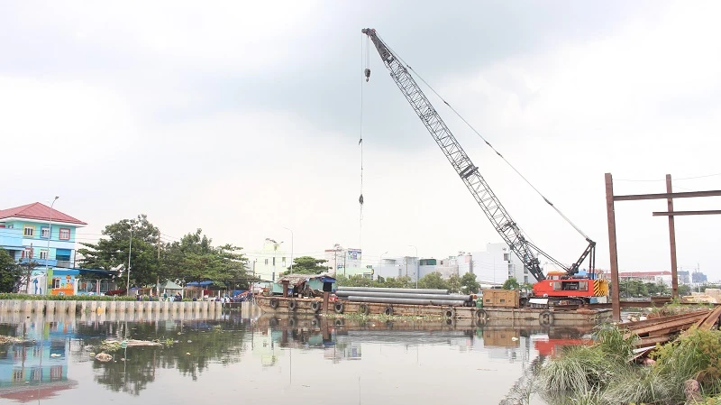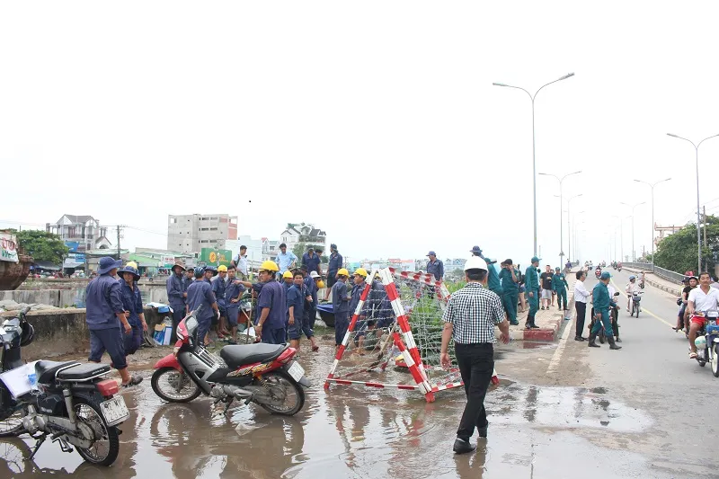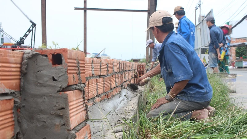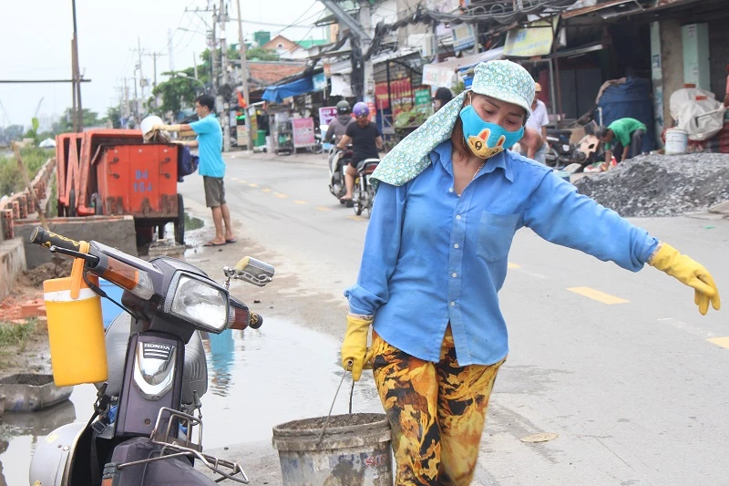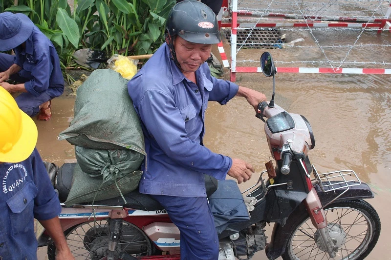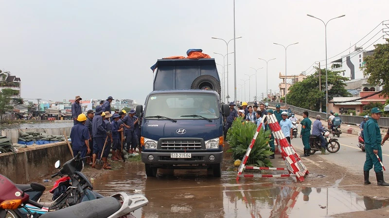 Theo ghi nhận của PV vào lúc 16 giờ ngày 30-9, các lực lượng chức năng kết hợp với đơn vị ra sức củng cố bờ đê tại cầu Kênh Ngang số 3 và đường Mễ Cốc (phường 15, quận 8).
