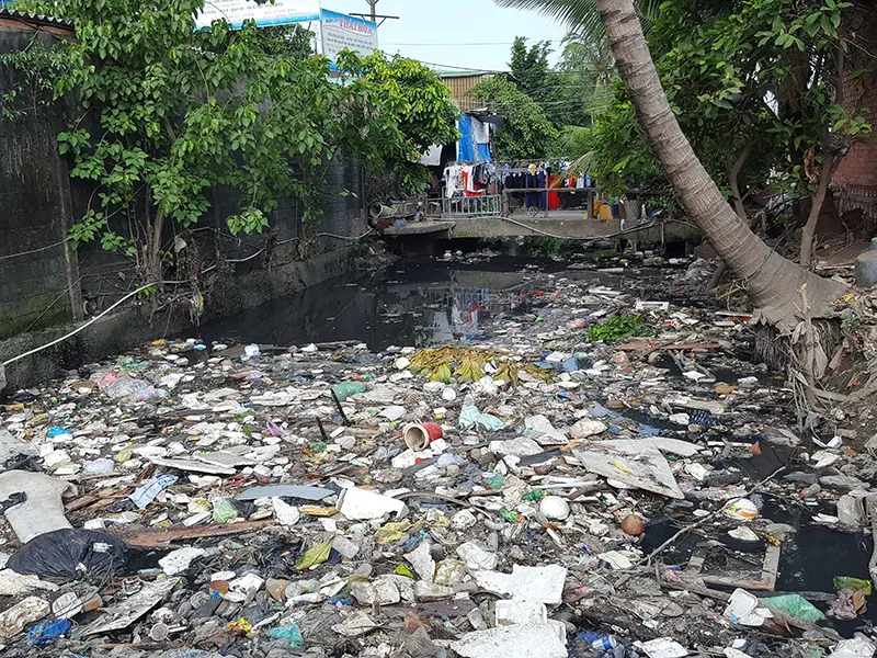 Kênh Hy Vọng, một trong ba hướng thoát nước sân bay Tân Sơn Nhất thường xuyên ngập rác. Ảnh: T.THANH