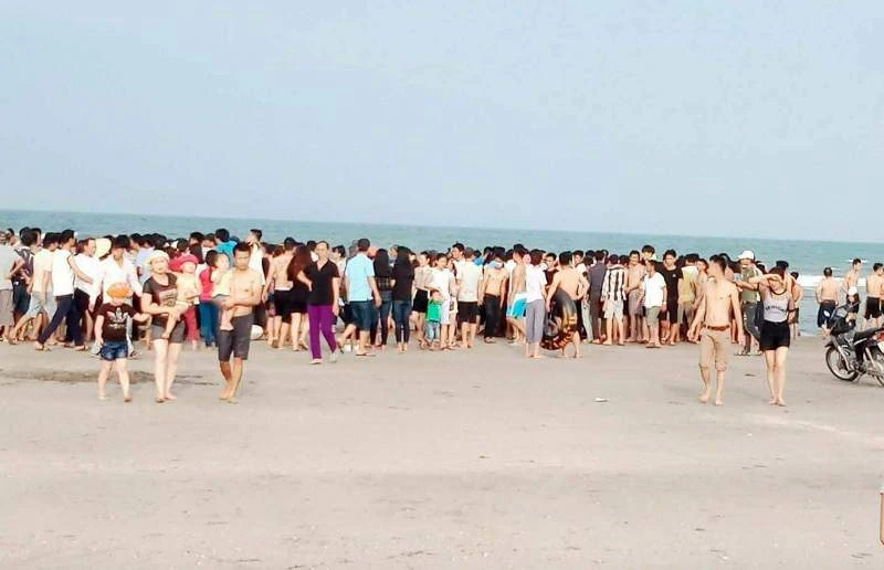Rất đông người dân ra bãi tắm nơi vợ chồng chị T., anh H. bị đuối nước.