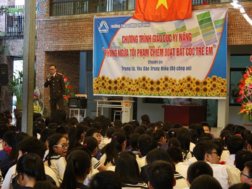 Một buổi giảng dạy về kĩ năng phòng ngừa tội phạm bắt cóc trẻ em của Trung tá Đào Trung Hiếu dành cho học sinh tiểu học.
